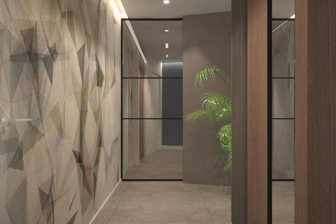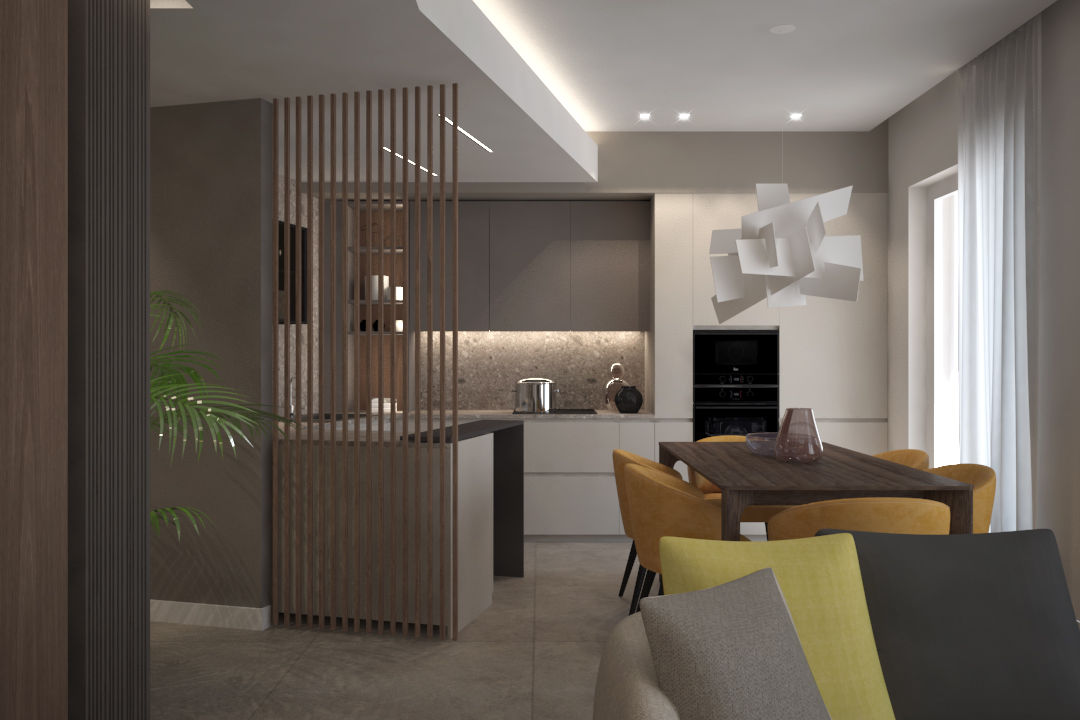 Al margine orientale del comune di Napoli una serie di complessi residenziali ha subito una rapida crescita a partire dagli anni ‘80. Ed è proprio in questo contesto urbano che viene richiesto allo studio un intervento di manutenzione straordinaria in un immobile di circa 100 mq. I proprietari hanno espresso fin da subito come priorità assoluta la necessità di una più ampia superficie dedicata al soggiorno, direttamente comunicante con la cucina, e due bagni più spaziosi e funzionali. Il progetto si evolve di conseguenza a partire dalla riorganizzazione degli spazi in chiave moderna, generando ambienti ottimizzati e dinamici che si adattano perfettamente all’impianto di base dell’appartamento. La zona giorno, ora nettamente separata dalle camere da letto, attraverso un accurato studio di quinte ed illuminazione, risulta più ampia e luminosa, mantenendo tuttavia celata la zona operativa della cucina con un filtro realizzato in listelli di legno. Anche le camere da letto vengono completamente ridisegnate, prevedendo uno studio/camera per gli ospiti nei pressi dell’ingresso e restituendo importanza alla camera patronale considerando la presenza di un’ampia cabina armadio ed un bagno in camera.