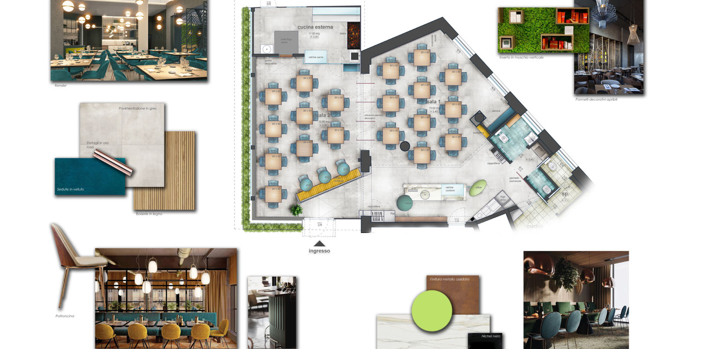 La committenza richiedeva un restyling significativo per trasformare l’atmosfera del locale in una veste nuova e sofisticata, con l’utilizzo di materiali pregiati che ne modificassero il mood rendendolo più ricercato ed elegante. Con l'obiettivo di perseguire tale risultato, il progetto del ristorante parte da una razionale ridistribuzione degli elementi delle sale, focalizzandosi poi sulla risoluzione di tutti i difetti estetici e funzionali della struttura e limitando considerevolmente le opere edili lasciando il layout degli ambienti inalterato. L’ingresso è stato caratterizzato con un elemento che incanala il flusso verso la sala principale interna. Questa ospita il bancone bar/mobile cassa, che prende il posto di quello preesistente ma viene totalmente reinterpretato nelle funzioni e nell'estetica, realizzato artigianalmente su disegno dello studio. L’accesso all’altra sala è stato ridefinito con pannelli decorativi apribili, che enfatizzano l’effetto filtro. Da ogni sala è sempre possibile intravedere installazioni progettate dallo studio che generano uno strategico gioco di quinte sceniche, costituite da listelli di legno, pareti in muschio e colori vivi, che conferiscono profondità e generano curiosità nei fruitori.