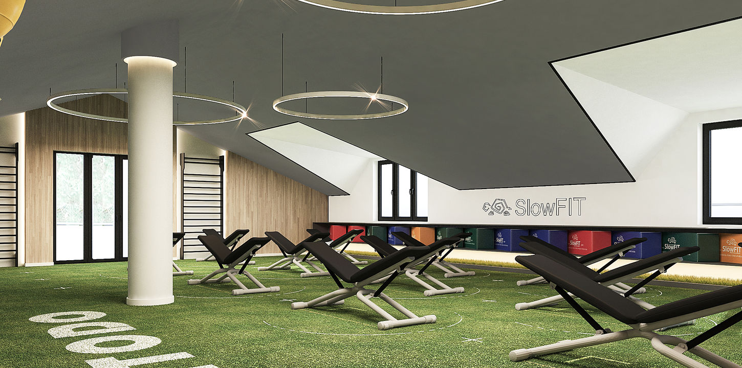 Sviluppata su 3 livelli con annessi spazi esterni pertinenziali, la Medicalsport costituisce un vero e proprio riferimento nella cultura del fitness di tutte le età. Il metodo di allenamento internazionale “SlowFit” è stato ideato da un team coordinato dal fondatore del club; quest ultimo ha incaricato lo Studio di ristrutturare interamente la palestra dal look ormai desueto e sviluppare un nuovo mood coerente con la sua visione. Dopo aver stabilito il nuovo stile del brand è nato un interessante progetto che, intervenendo sulla pelle degli ambienti senza toccarne la struttura, si discosta dall’ormai noto concetto di club “strong” lasciando spazio a forme più gentili e una palette colori più distensiva che porta all’interno il verde che circonda lo stabile, grazie ad inserti di muschio stabilizzato a parete. Sulla base dei nuovi colori societari sono stati riprogettati completamente l’ingresso, la sala attrezzi vicino all’ingresso e la sala corsi al primo piano. Per quest’ultima è stato previsto un pavimento effetto prato con grafiche studiate ad hoc per i corsi di SlowFit. I materiali utilizzati e la predilezione per uno stile total white con elementi dai toni accesi donano al club un carattere fresco e al contempo accogliente.